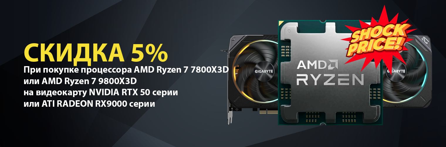 Скидка на видеокарты NVIDIA RTX 50-й серии и ATI RADEON RX 9-й серии при покупке процессора AMD Ryzen 7 7800X3D или AMD Ryzen 7 9800X3D.